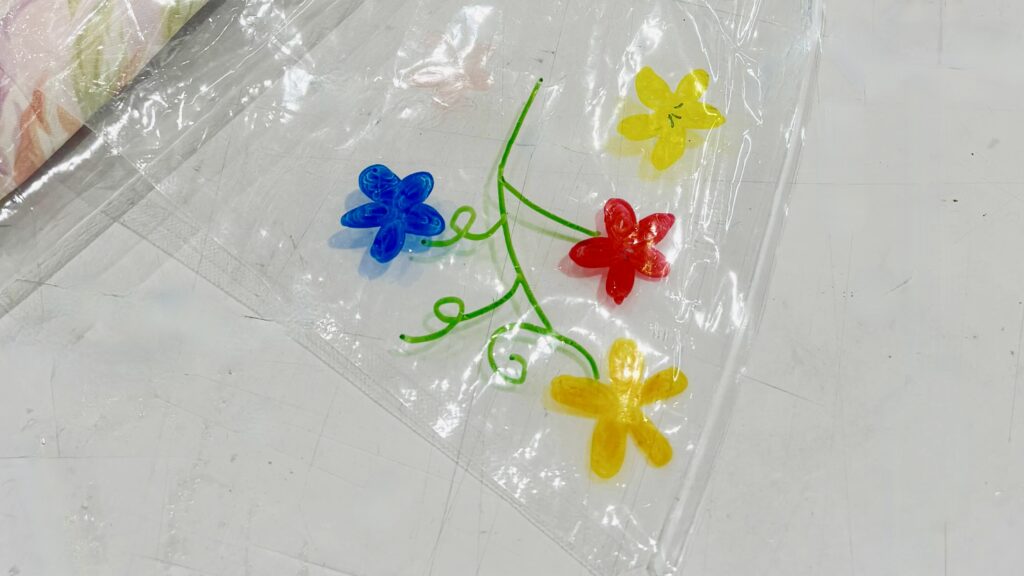 展示ユニットにかける屋根は、不要になった傘を解体し、縫い合わせて作っています。屋根のビニール傘部分に、自由に絵を描いてみませんか。